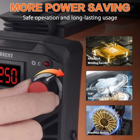 La tecnología de inversor IGBT mejorada por la máquina de soldadura mantiene el arco estable y la soldadura suave. Antiadherente automático incorporado, compensación por fluctuación de voltaje, protección contra sobrecorriente, protección contra sobrecalor, protección contra sobretensión y bajo voltaje, protección contra daños en cortocircuito, para asegurar un funcionamiento seguro y una larga vida útil del kit de soldadura.